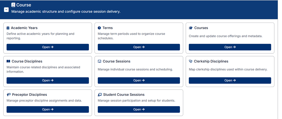 This section supports the full lifecycle of course setup—from high-level academic years and terms to detailed session scheduling and discipline mapping.