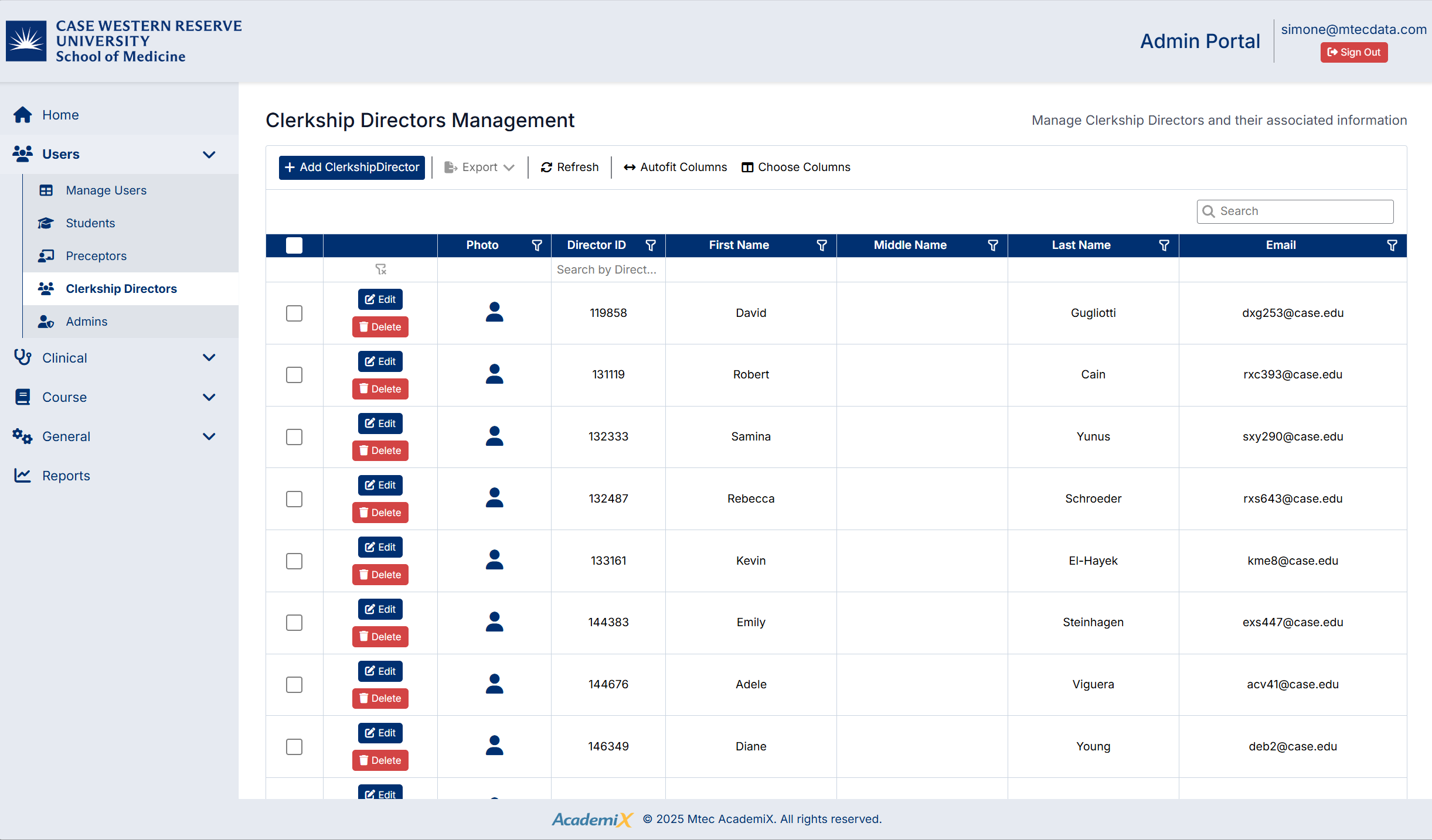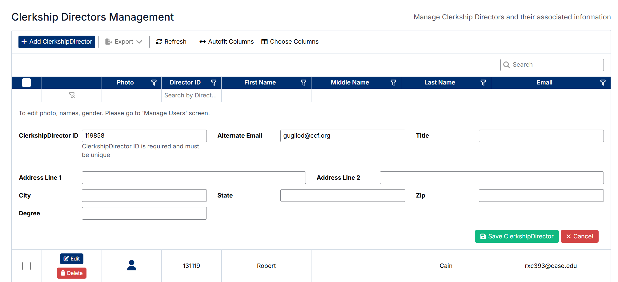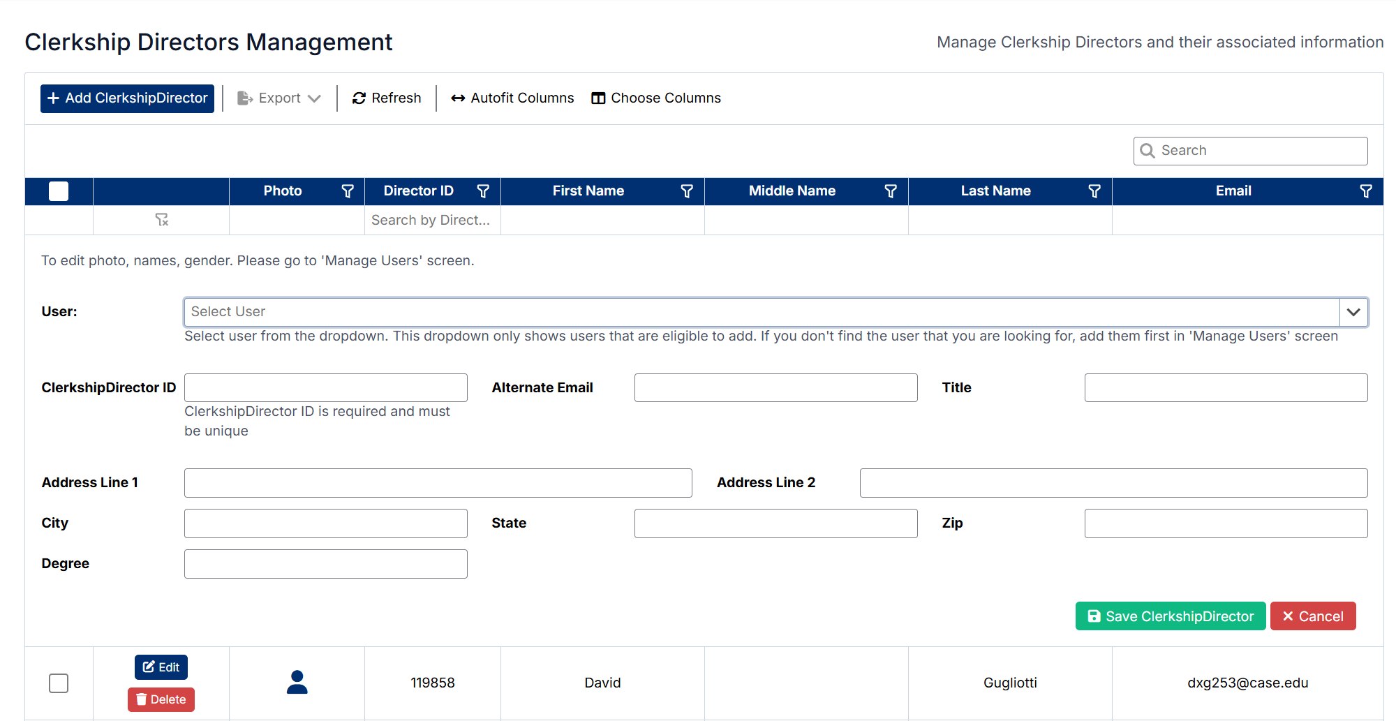 The Clerkship Director Management screen will display a list of all clerkship directors in the system.