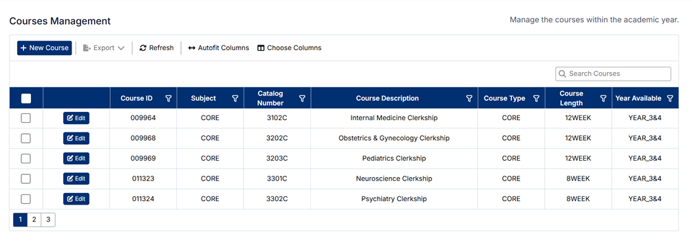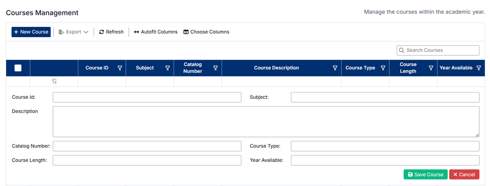 - The toolbar includes options such as New Course, Export, Refresh, and column configuration