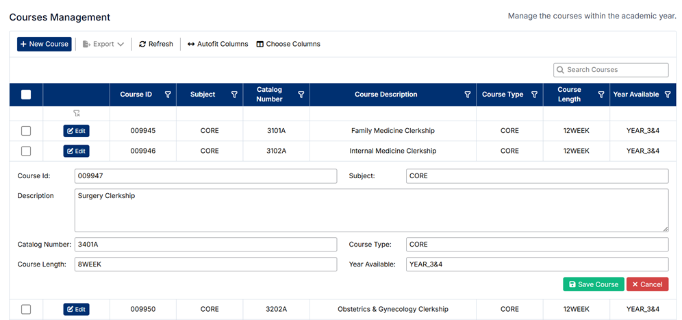 - Each course can be edited directly from the list