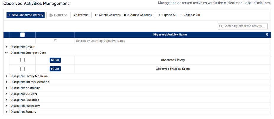 The Observed Activities Management screen allows administrators to define and maintain the clinical activities that can be observed and tracked within the system. These activities represent the tasks or interactions that students perform and are evaluated on during their clinical training.