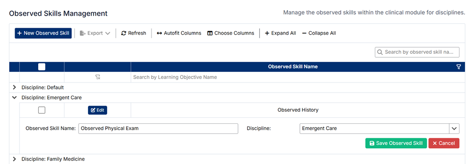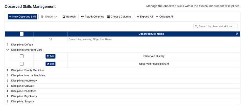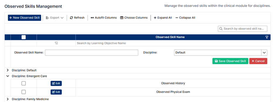 The Observed Skills Management screen allows administrators to define and maintain the clinical skills that are tracked and assessed within the system. These skills represent specific competencies that students are expected to demonstrate during their clinical training.