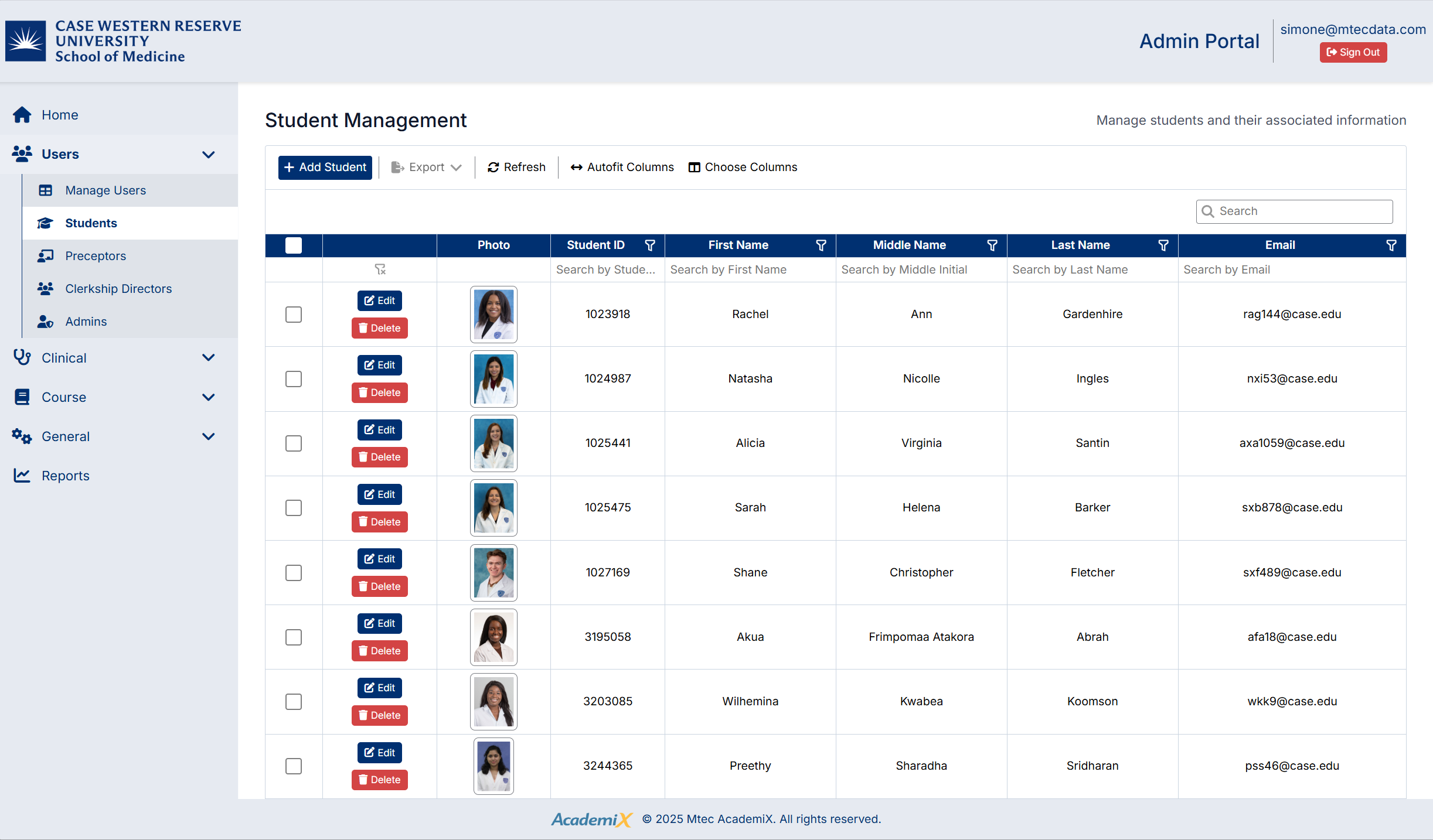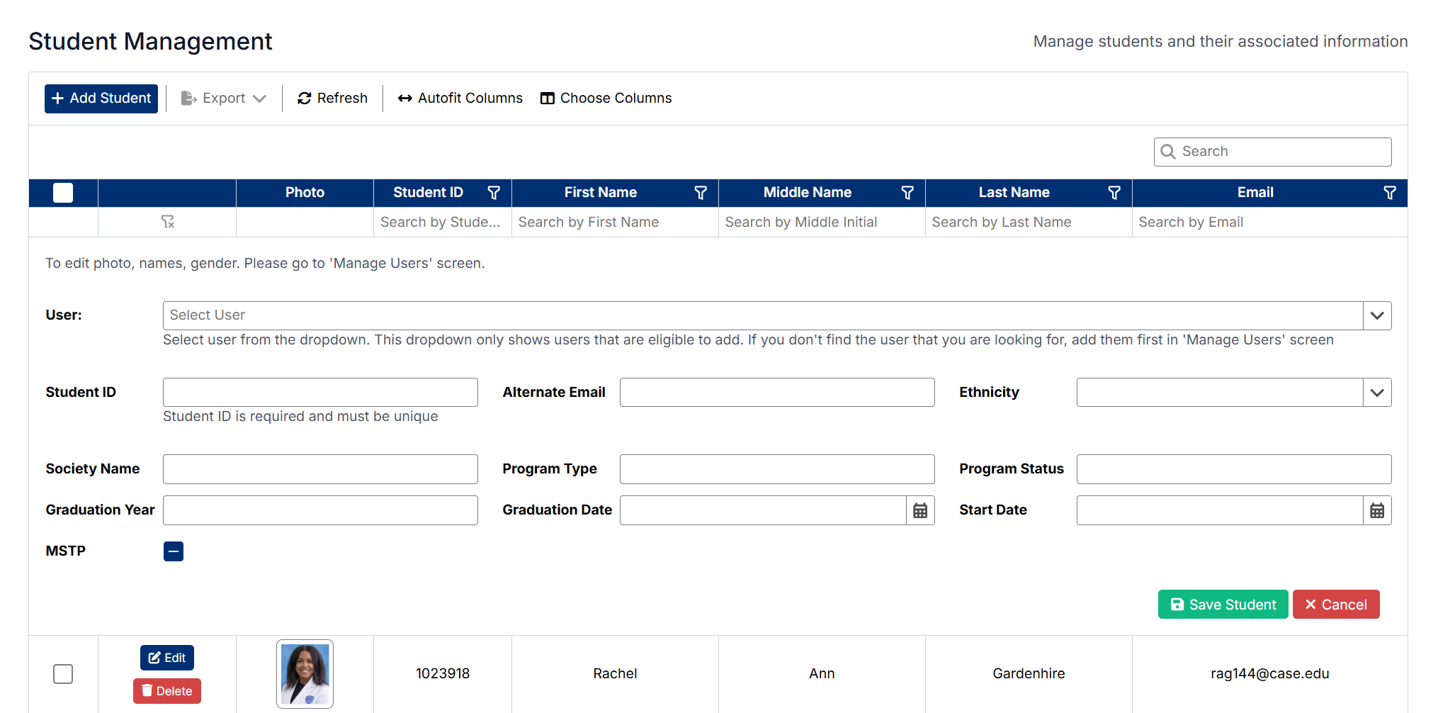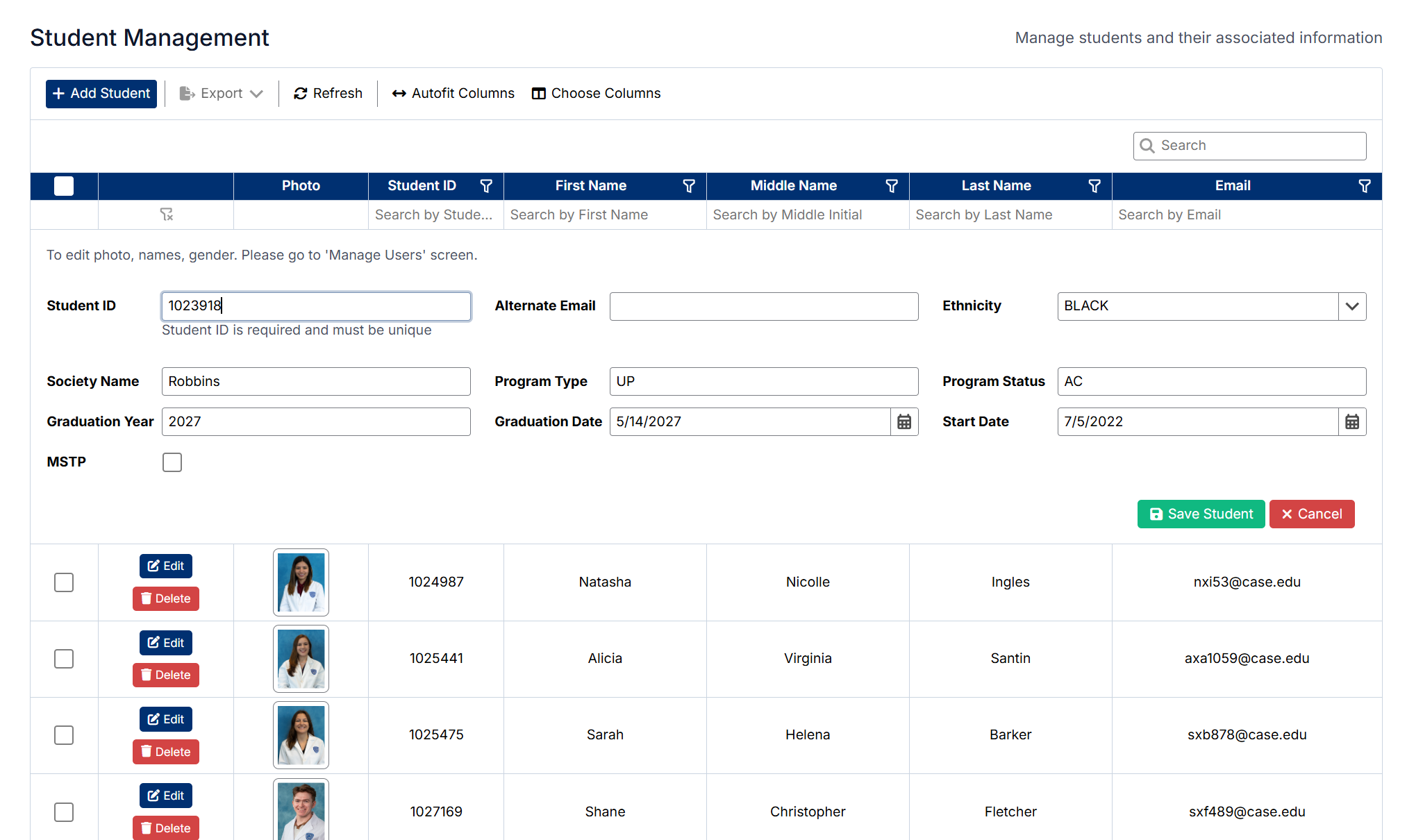 - A toolbar with actions such as Add Student, Export, Refresh, and column settings