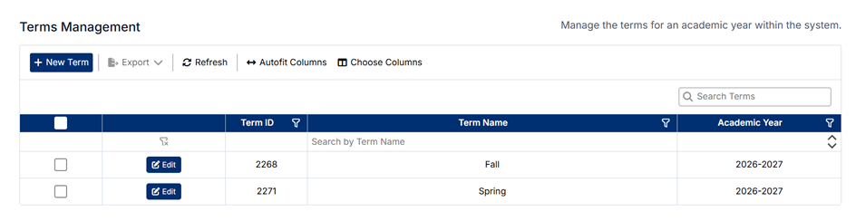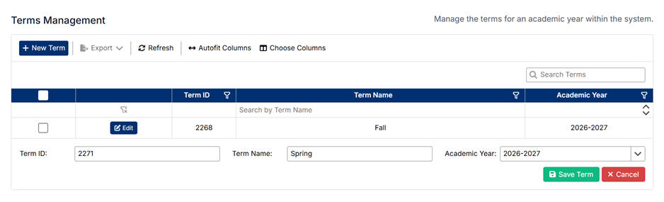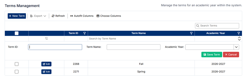The Terms Management screen allows administrators to define and maintain academic terms within an academic year. Terms are used to organize the scheduling and delivery of courses, such as semesters, quarters, or blocks.